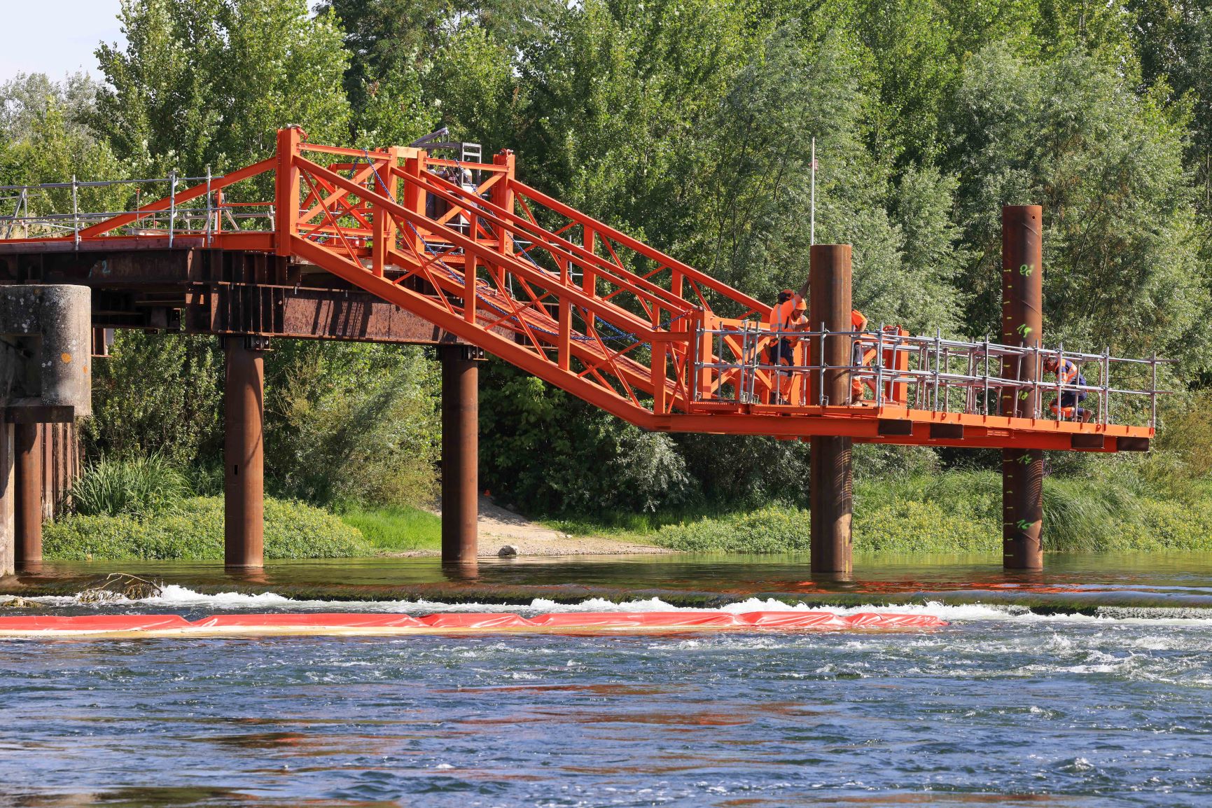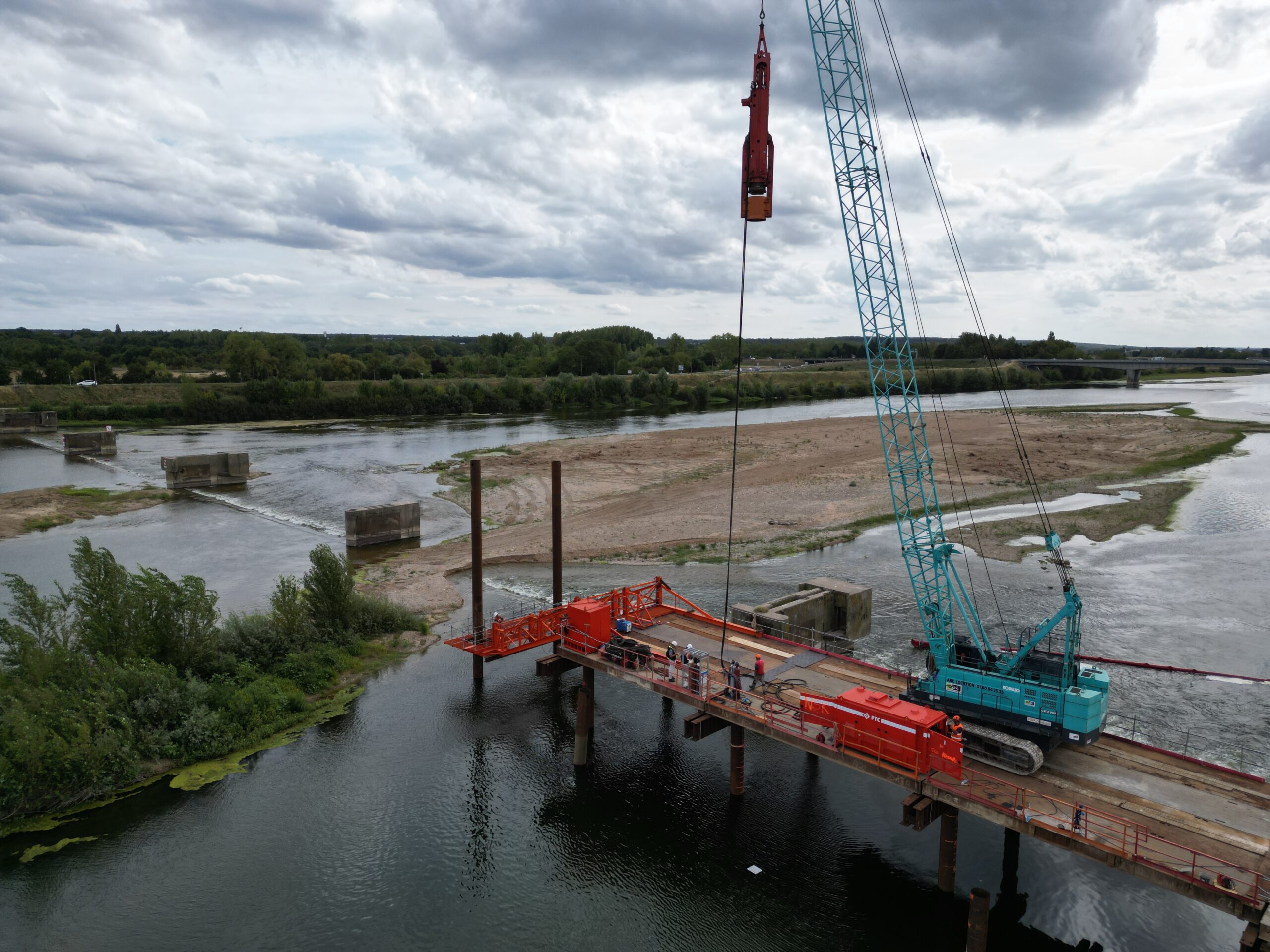 Septembre 2025 – L’estacade permet d’accéder aux piles de l’ancien barrage pour les réparer. © CD41/X.Leone